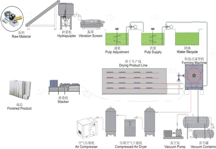 2-成型系統(tǒng):轉(zhuǎn)鼓式成型機,模具,空壓機,空壓機罐,真空泵,真空罐,高壓水泵,汽水分離泵等。